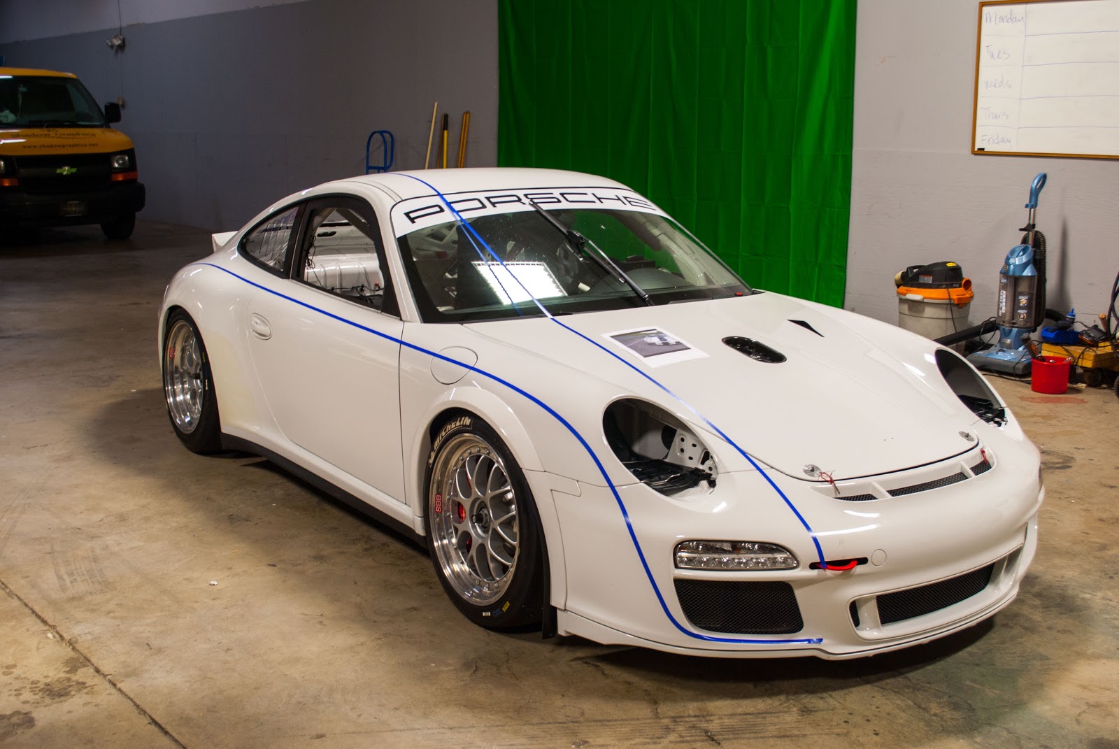 This Porshe 911 came to us in bare bones. A Basic white paint job. It was our task to transform this car into a racer with specialty 3M and Avery Vinyls. Everything would be customized pin striping with some hand vectored graphics from front to back. Here we have already laid down two lines for a starting template.